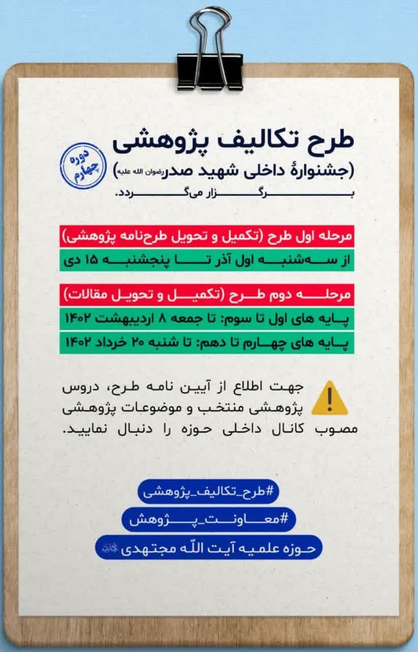 به حول و قوه ی الهی زمان بندی مرحله دوم طرح تکالیف پژوهشی نیمسال دوم سال تحصیلی 1401-1402 اعلام گردید.